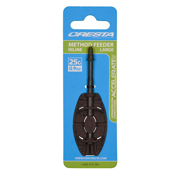 De Cresta Accelerate Inline Method Feeders zijn vervaardigd uit één stuk metaal en voorzien van een baittable in het midden. De feeder is afgewerkt met een soft-touch camo coating en uitgevoerd met een sleuf in de bodem. De Accelerate Inline Method Feeders zijn uitgerust met een verwijderbare harde kunststof tube met afneembare sleeve en een Integrated Stem Change System voor het wisselen van stems en feeders.