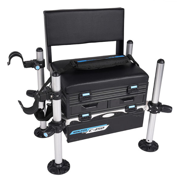 De Cresta Solith 450 Seatbox is uitgevoerd met een aluminium frame, rugleuning en vier verstelbare 36 millimeter poten met kantelbare moddervoeten. De zitkist beschikt over een basiscompartiment onder het frame, twee frontlades en een standaard compartiment van 40 millimeter en wordt geleverd met een afneembare, gevoerde schouderband. De Cresta Solith 450 Seatbox zitkist wordt standaard geleverd met twee hengelsteunen.