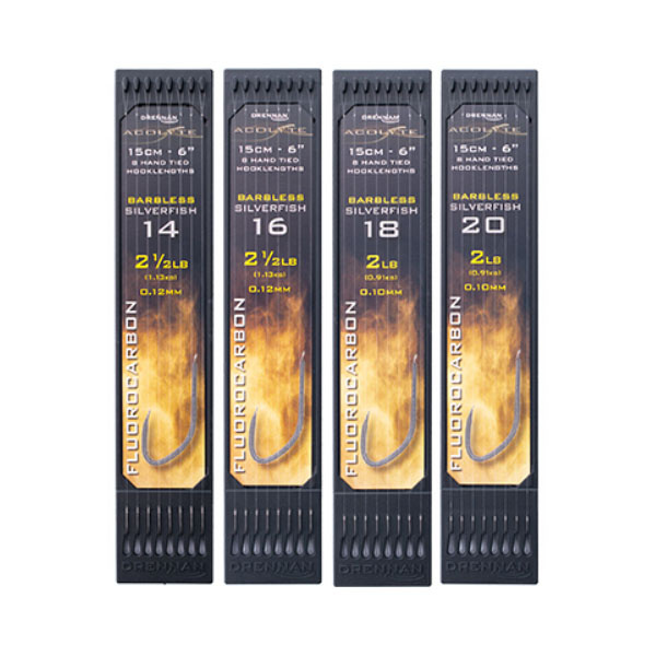 De Drennan Acolyte S Fish Hooklengths zijn onderlijnen met weerhaakloze Silverfish haken, handgeknoopt aan Acolyte Fluorocarbon. De onderlijnen zijn geschikt voor gebruik met klein aas zoals maden, casters en wormen. De Drennan Acolyte S Fish Hooklengths hebben een lengte van 6 inch/15 centimeter.