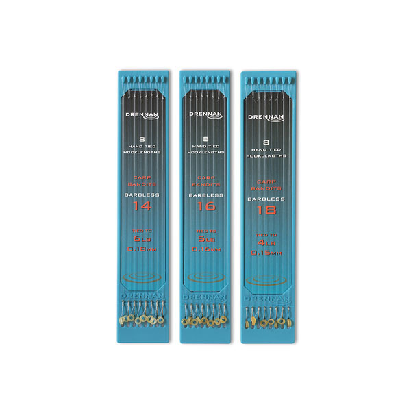De Drennan Carp Bandit Hooklengths zijn onderlijnen met weerhakloze Carp Hair Rigger haken met een naar buiten staand oog, ontworpen om de haak recht op de onderlijn te laten zitten. De onderlijnen zijn voorzien van een bait band die kan worden gebruikt met pellets en zacht aas zoals mais en vlees. De Drennan Carp Bandit Hooklengths hebben een lengte van 6 inch/15 centimeter.