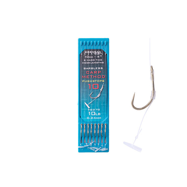 De Drennan Carp Method Pushstop Hooklengths zijn kant-en-klare method feeder onderlijnen met Carp Method haken, geknoopt aan 4 inch/10 centimeter monofilament. De onderlijnen zijn uitgevoerd met een pushstop en worden geleverd op 4 inch hook plates die de rigs onder lichte spanning houden voor een rechte lijn zonder knikken. De Drennan Carp Method Pushstop Hooklengths zijn geschikt voor opslag in het Drennan Hook Book en in de 4”/10 cm en 6”/15 cm Hook Box.