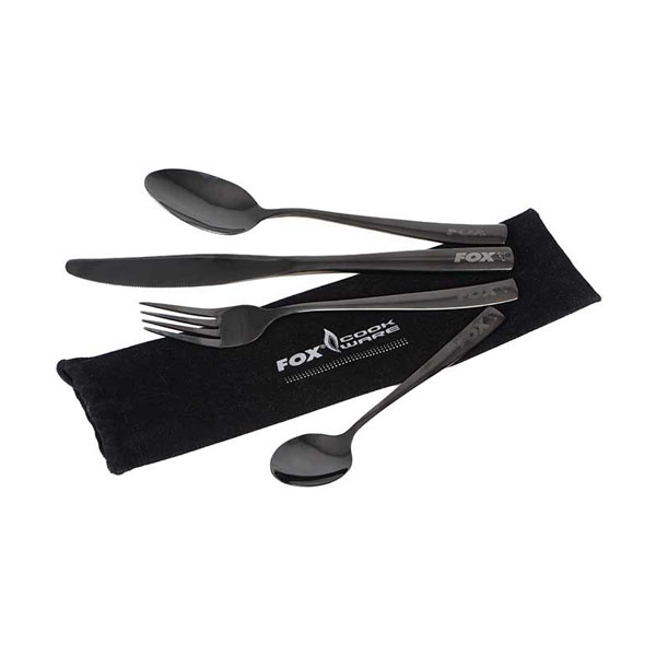 De FOX Cookware Black Stainless Cutlery Set is een bestekset van zwart roestvrij staal in een opbergzak met trekkoord. De set bestaat uit een theelepel, mes, vork en dessertlepel.