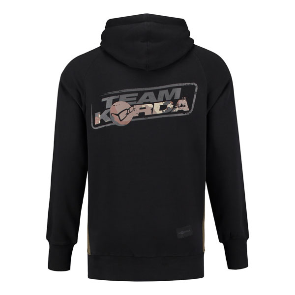 De Korda Kore TK Hoodie Black is een hoodie met een aansluitende pasvorm. De hoodie is gemaakt van 320 gsm fleece jersey materiaal en uitgevoerd met raglan schouders en stretchpanelen onder de armen. De capuchon heeft een overlappende pasvorm met verstelbare koorden. Aan de voorzijde bevindt zich een kangoeroezak met twee interne opbergvakken.
