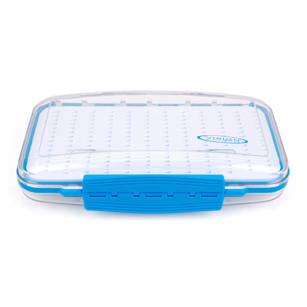 De Vision Aqua Fly Box is een waterdichte vliegendoos met transparante kunststof deksel met Vision fishcamo-patroon. De Medium-variant heeft twee identieke secties met foam voor kleine en middelgrote vliegen. De Large-variant heeft twee secties met verschillend foam: één zijde met individuele gaten voor kleine en middelgrote vliegen en één zijde met rechte sleuven voor vliegen met grotere haken.